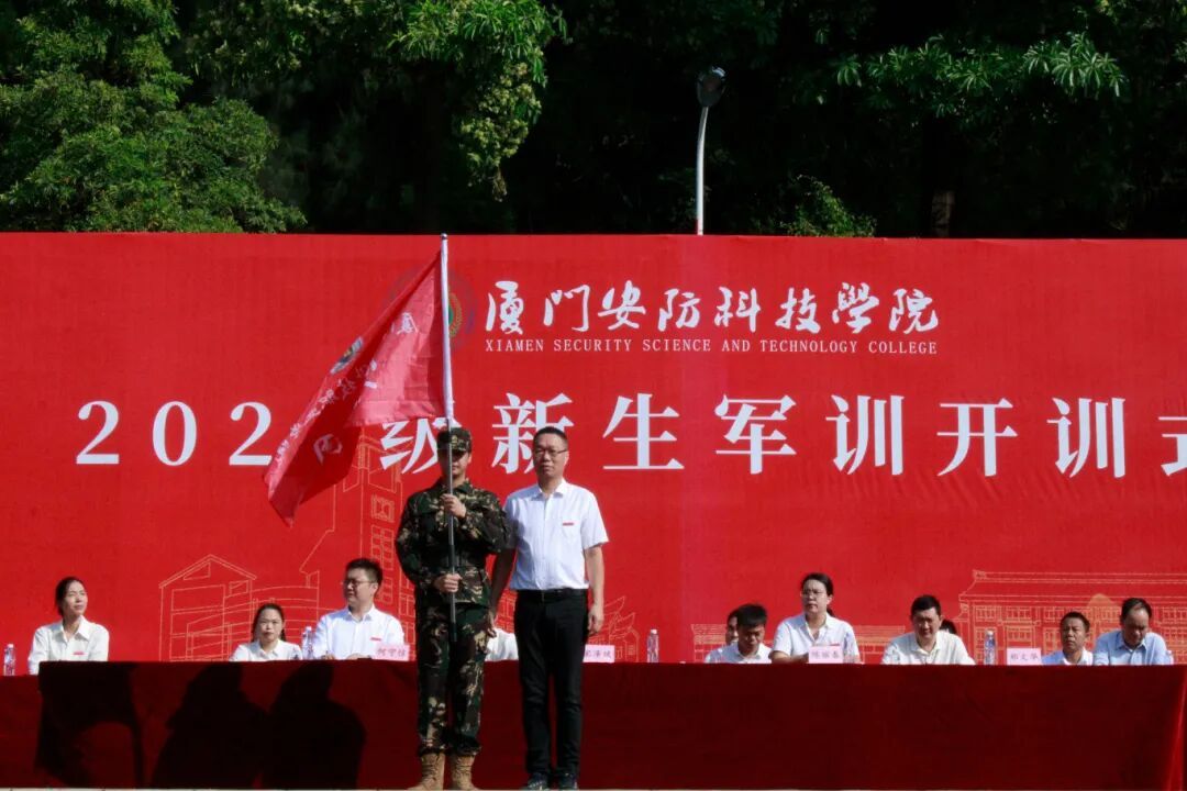 校长助理郑文华为军训教官代表授旗。