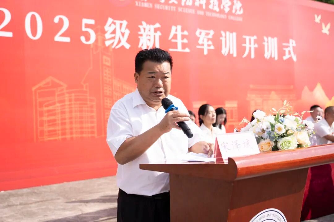 校长宋泽斌在致辞中指出,军训是学校人才培养体系中极具特色的实践环节,是培养新时代高素质技术技能人才的重要举措。他结合学校校训,对新生提出三点要求:一是以“明德至善”铸魂,深植家国情怀,在军训集体中厚植团结协作精神,为成长为德才兼备的应用型人才奠定思想根基;二是以“技行天下”赋能,通过队列动作、内务规范等军事技能训练,培养精益求精的工匠精神、高效的执行力与专注力;三是以“攻坚克难”砺志,在军事训练中锻造坚韧不拔的意志品质,直面挑战、超越自我。