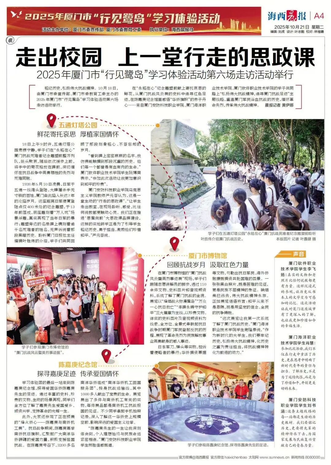 10月18日,由厦门市委宣传部、厦门市委教育工委主办的2025年厦门市“行见鹭岛”学习体验活动在厦门精彩启幕。我校学生代表与思政教师代表有幸参与其中,通过实地走访、现场教学等鲜活形式,深度探寻鹭岛的历史文脉,用心汲取红色精神力量,切实推动思想政治教育工作取得新成效。