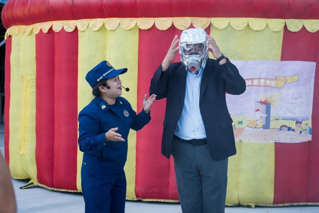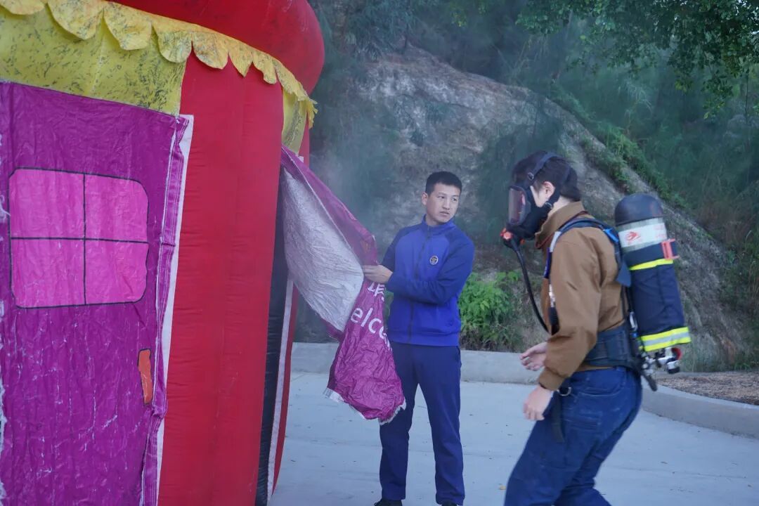 实操演练环节设置灭火器材操作、逃生帐篷体验、消防装备科普等多个实战项目。我校学子积极参与,在工作人员的专业指导下,逐一完成灭火器材正确使用、火灾现场逃生技巧、消防装备认知等实操训练,在沉浸式体验中熟练掌握实用消防技能,有效提升应急避险与协同处置能力。