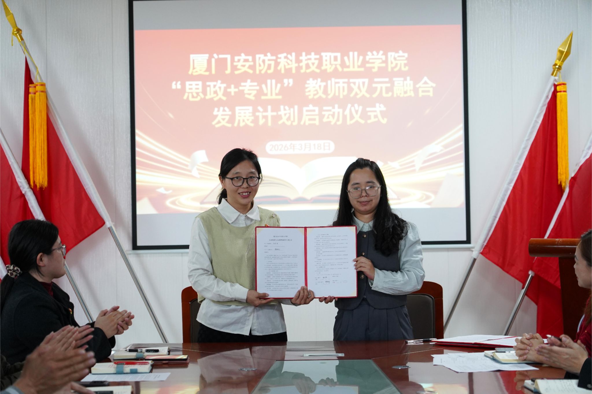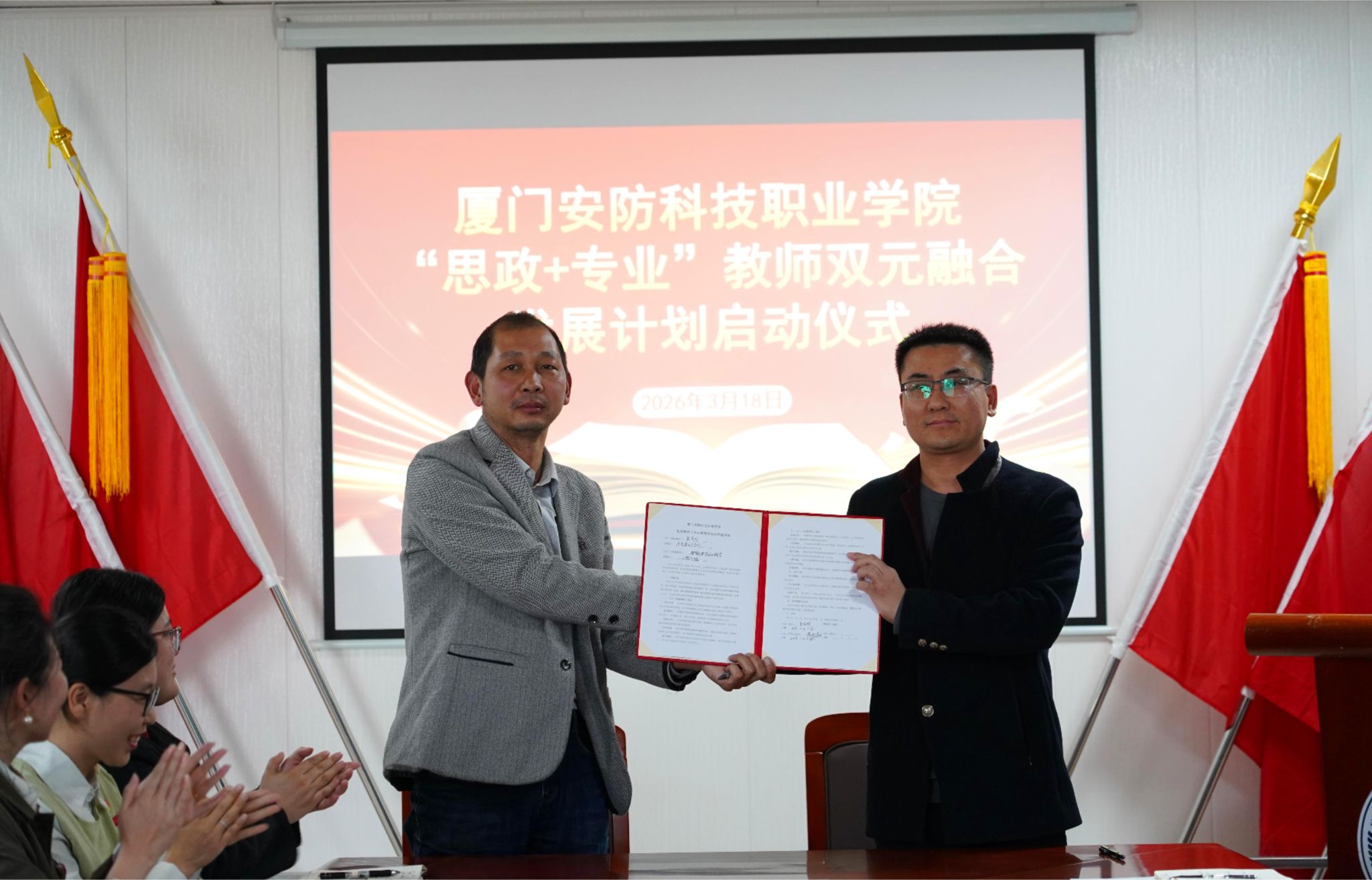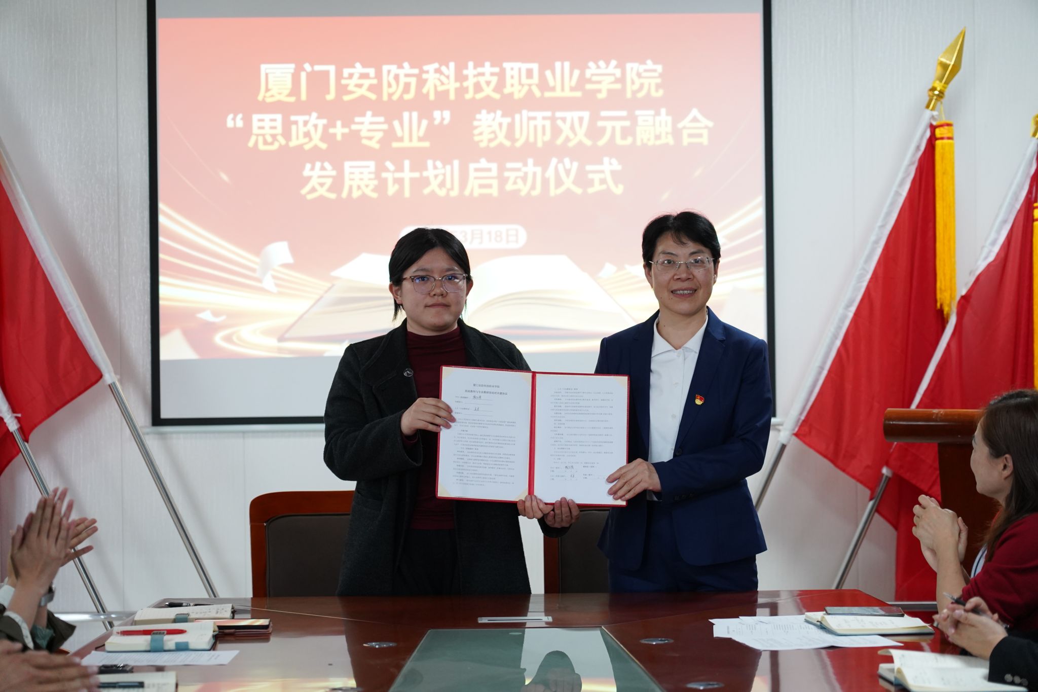 马克思主义学院副院长严元容现场宣读结对共建名单,马院吴光明、陈冬梅等四位思政教师,分别与交通学院、工程学院、软件设计学院等对应教研室结成共建小组,双方代表上台签署结对共建协议书,正式搭建思政与专业师资协同育人的联动纽带。