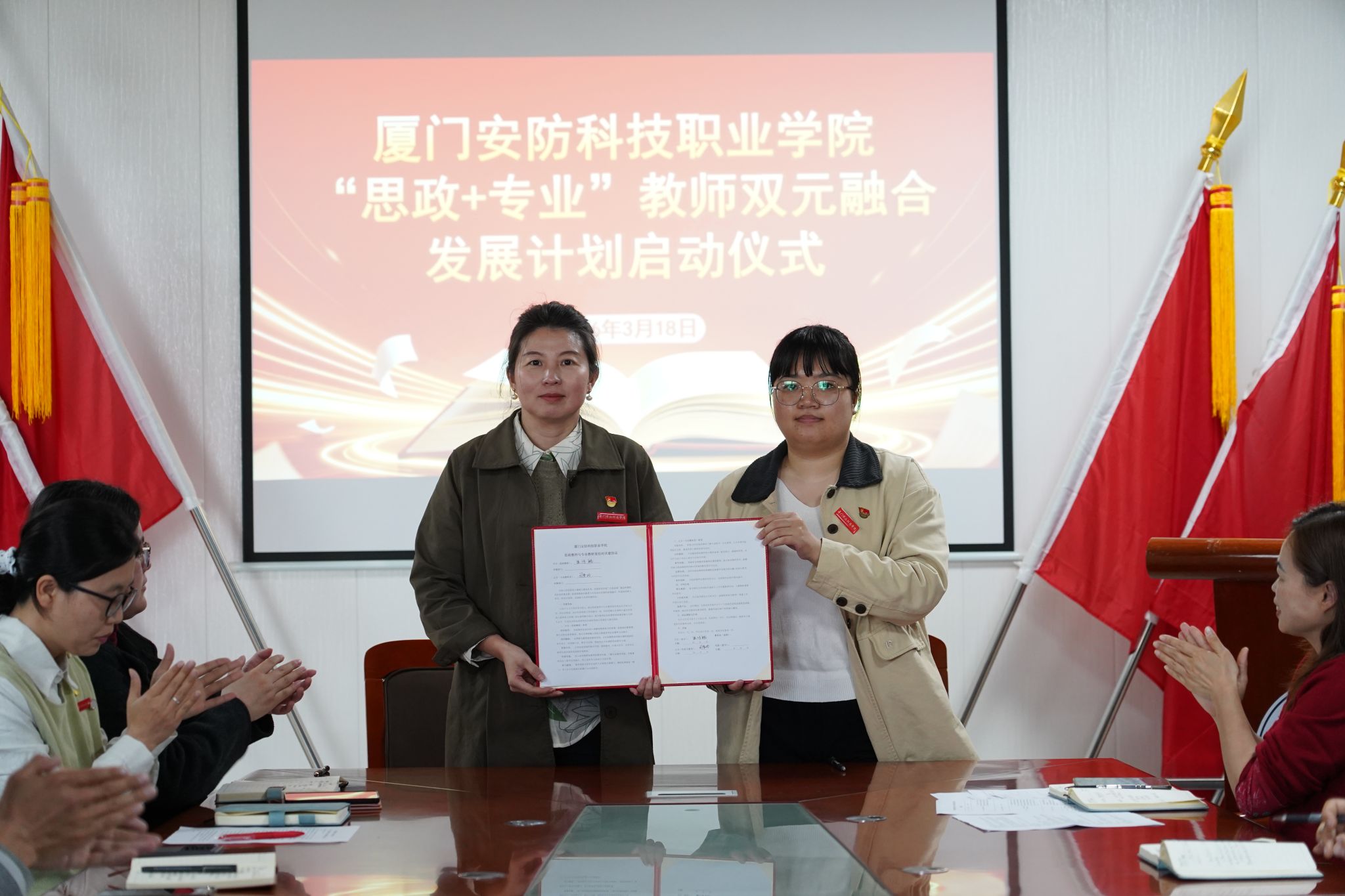为深入构建“大思政”育人格局,全面推动课程思政高质量建设,3月18日下午,厦门安防科技职业学院召开“思政+专业”教师双元融合发展计划会议。副校长何守信出席会议,教务处处长胡小春、马克思主义学院院长陈廷姣、各二级学院院长、教研室教师代表参会,会议由马克思主义学院副院长严元容主持。
