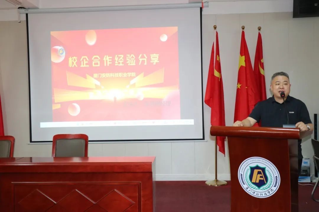 厦门安防科技职业学院副校长陈益健向与会嘉宾介绍了厦门安防科技职业学院的基本情况,回顾近年来学校在产教融合、人才培养领域的实践探索与成效,强调产教融合对职业教育高质量发展的关键作用。